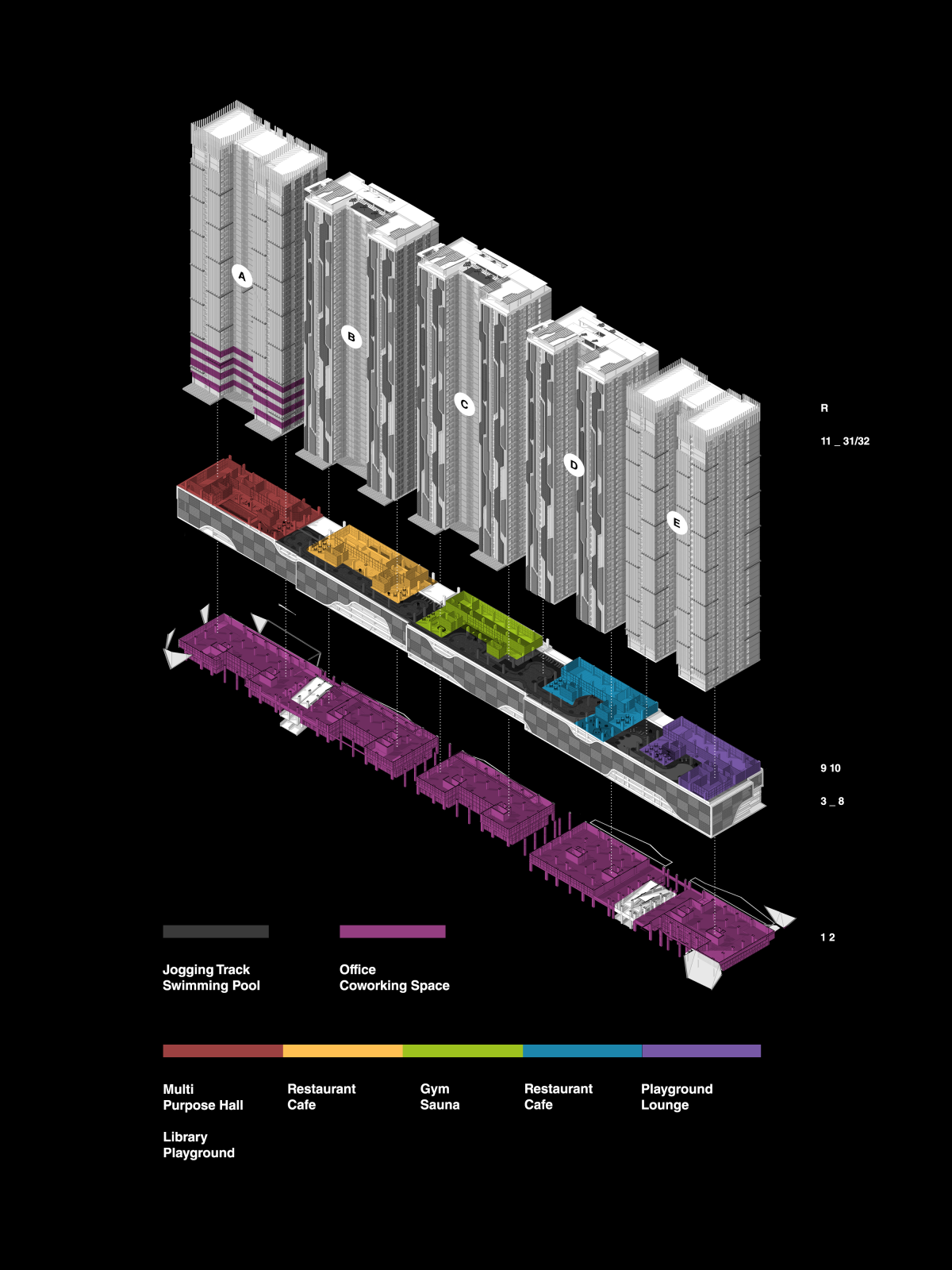 The uniqueness of this project is that we fabricated the form of each tower’s podium into one elongated shape that become the foot of the upper towers. 5 towers will be planned to have public facilities specifically designed to support the need for a decent living. These public facilities include Pool, Sky Garden, Poly Clinic, Gym, Spa, Lounge & Bar, Children Playground, Children Daycare, and Restaurant.